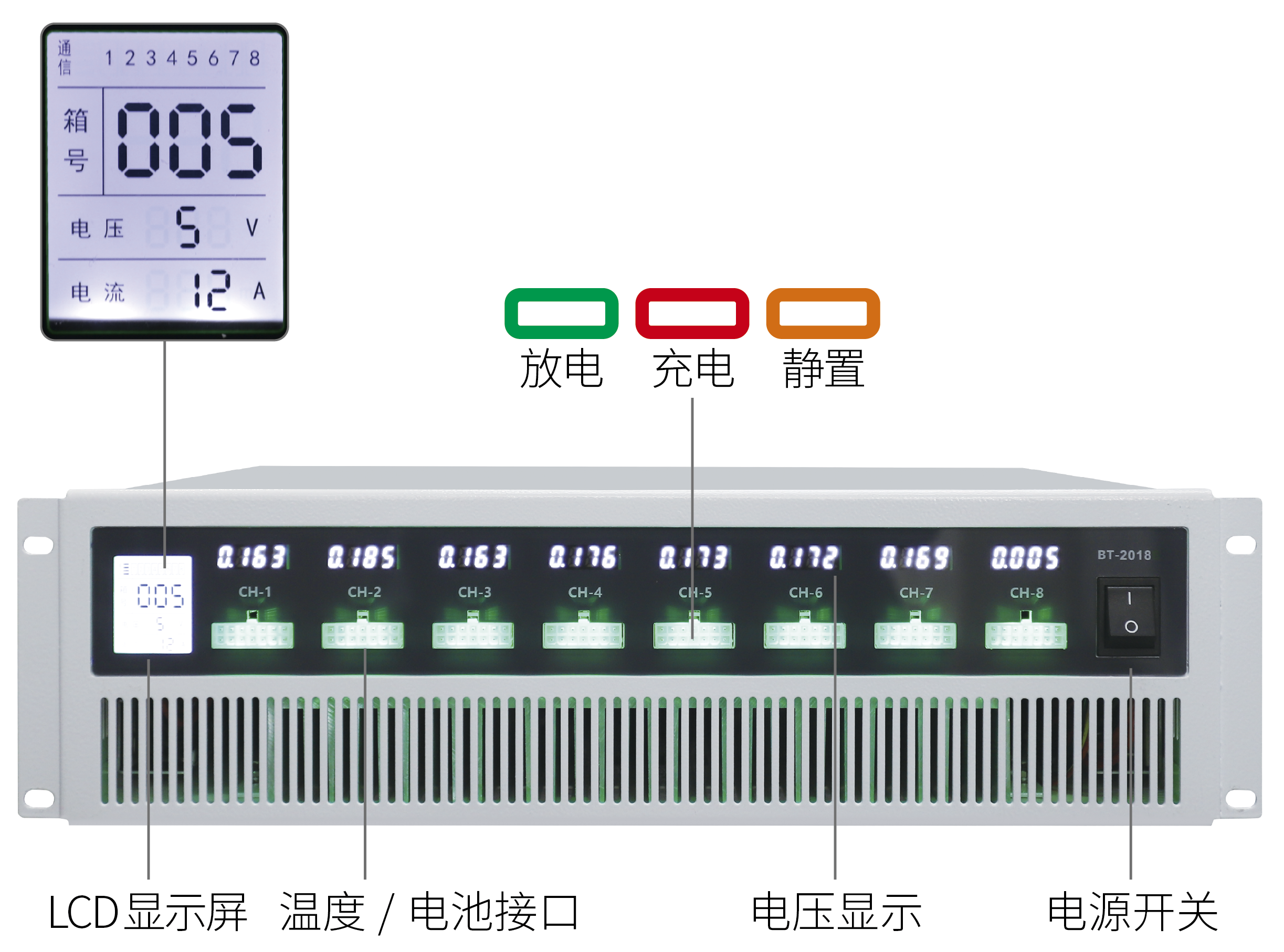 1、每個(gè)電池接口端配備一個(gè)電壓表,用來實(shí)時(shí)顯示電池電壓,在接入電池時(shí),可以判斷電池是否接入正確;