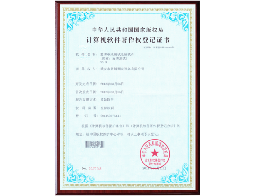 根據(jù)《計算機軟件保護條例》和《計算機軟件著作權(quán)登記辦法》的規(guī)定,經(jīng)中國版權(quán)保護中心審核,中華人民共和國國家版權(quán)局對藍博公司提交的電池測試系統(tǒng)軟件著作權(quán)認定為原始取得并予以登記,從頒證之日起,這套電池測試系統(tǒng)軟件的版權(quán)將得到中國版權(quán)保護中心的有效保護。
