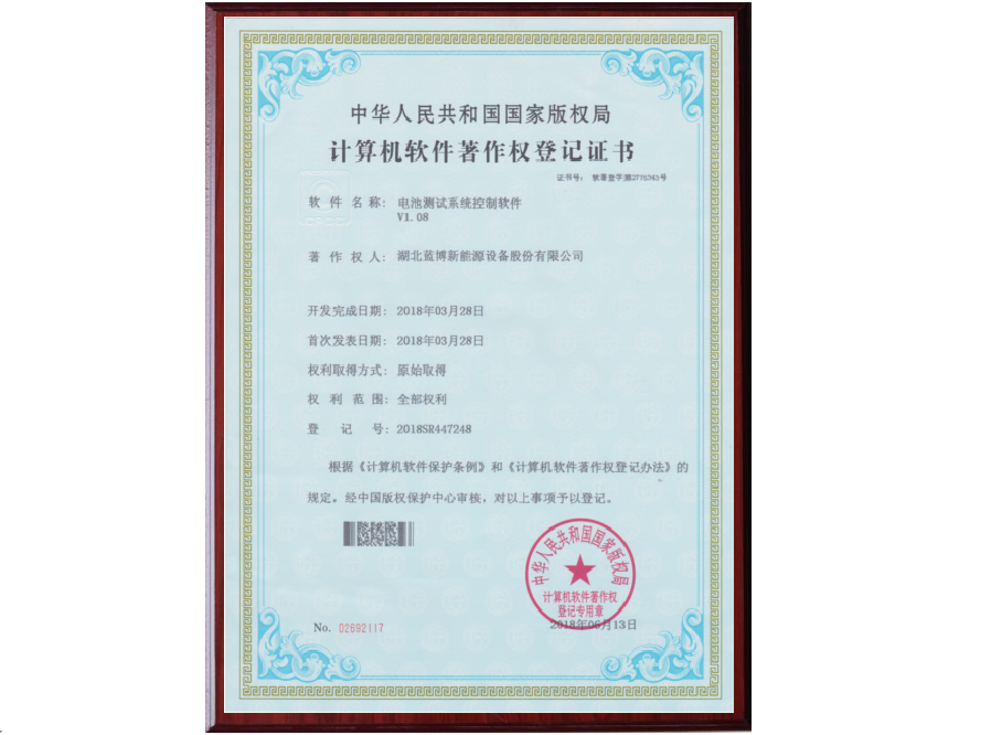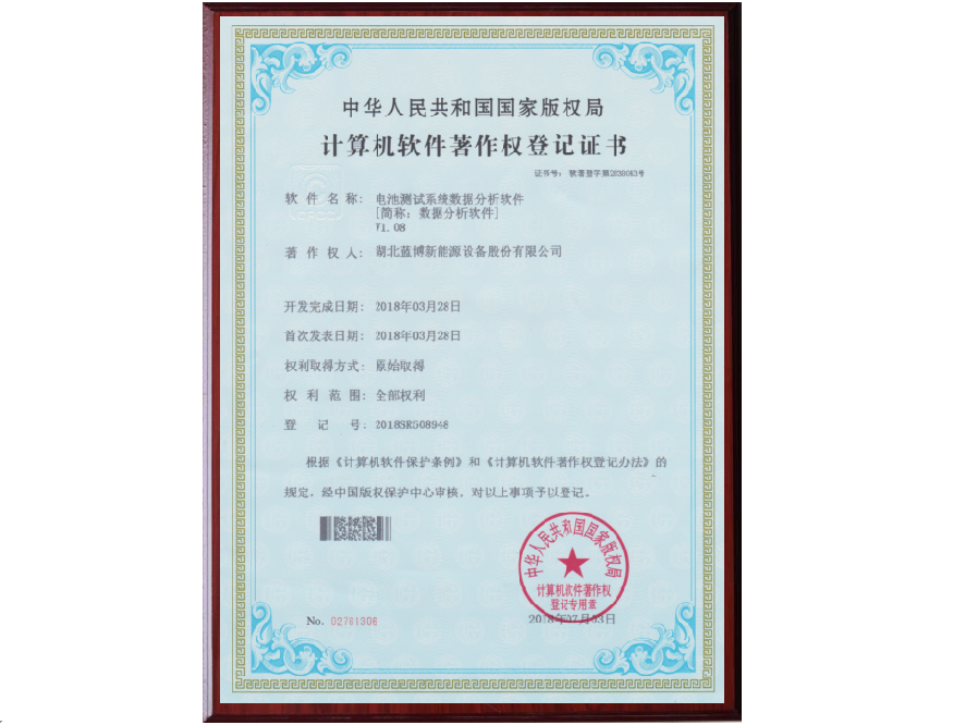 自2010年起,藍博公司技術(shù)市場團隊深入分析市場需求,定位研究目標和內(nèi)容,在產(chǎn)品線的協(xié)助下,合理組織公司資源,積極開展并高效完成藍博電池測試系統(tǒng)軟硬件的開發(fā),并于2013年5月、2018年1月、2018年2月向國家版權(quán)保護中心申報著作權(quán),經(jīng)過三個多月的嚴格審核,最終正式獲得軟件著作權(quán)。